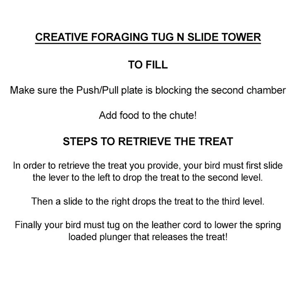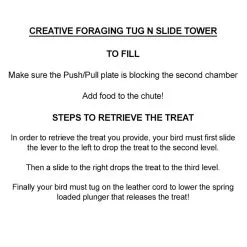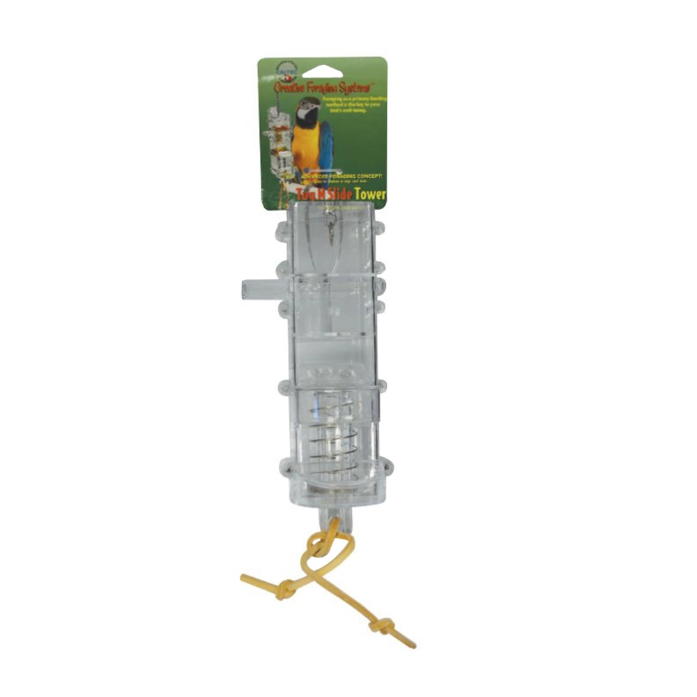 The Tug N Slide Tower Bird Foraging Toy (by Creative Foraging Systems) offers a workout sure to challenge mental and physical fitness. Durable, easy-clean polycarbonate toy withstands active daily play.